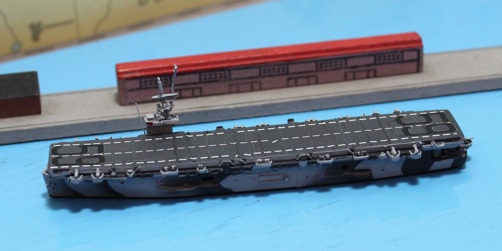 Zum Schiff: 1321* Casablanca, Z 1944, Geleitträger. 7.800 / 10.400 t, 19 kn. 1-12,7 cm, 16-4 cm, 20-2 cm, 28 Flugzeuge. 860 Mann Besatzung. Trainings- und Transportträger im Pazifik. 10.6.1946 a.D. Insgesamt 50 Einheiten, 5 Kriegsverluste